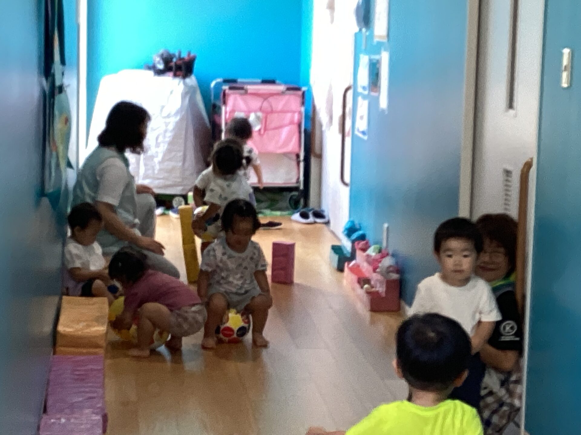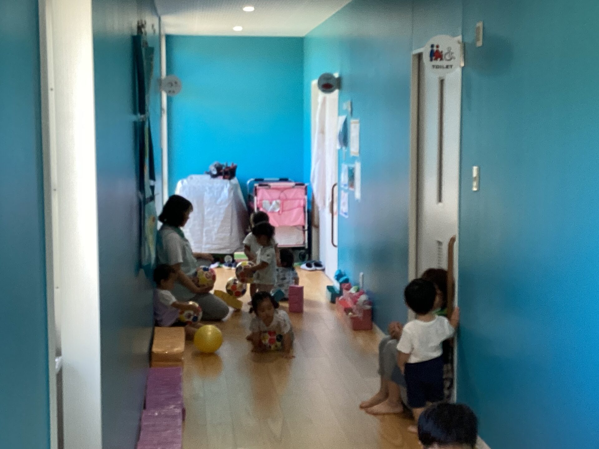 1歳児だいちチームさんは廊下を使ってボール遊びをしていました。