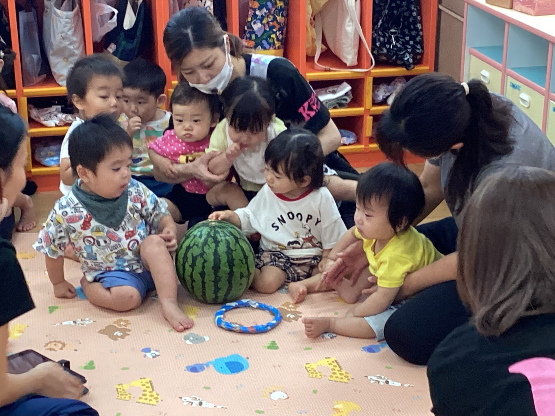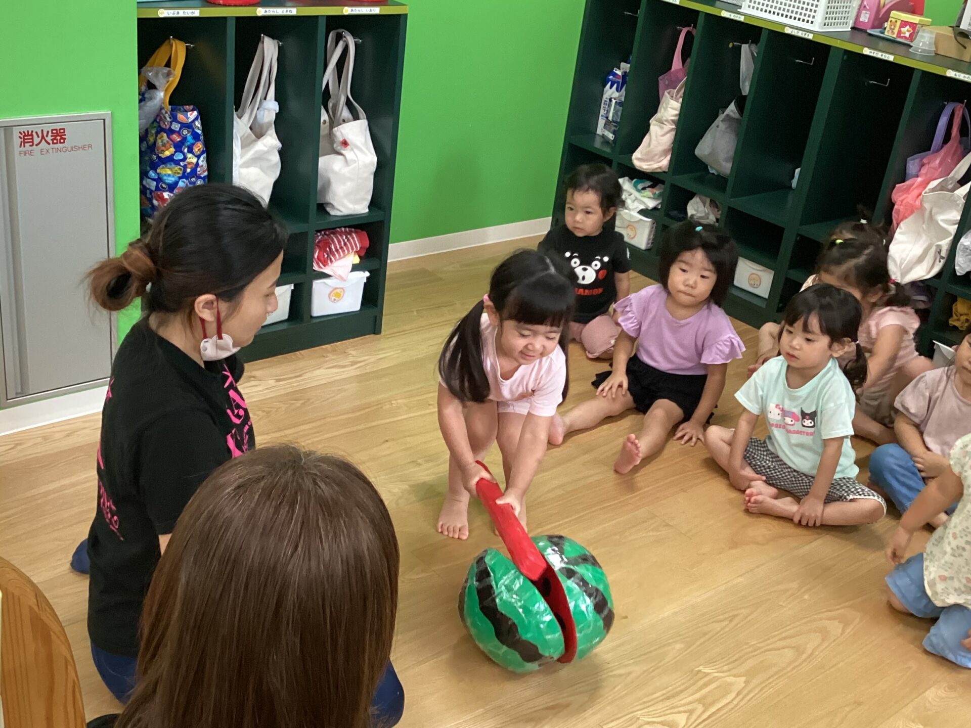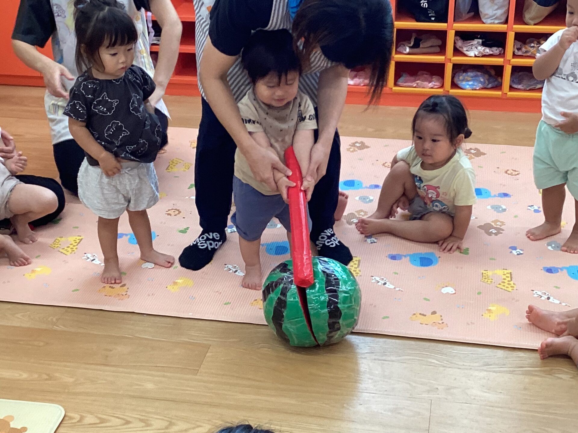 乳児さんは作りもののすいかで「すいかわり」をしました。