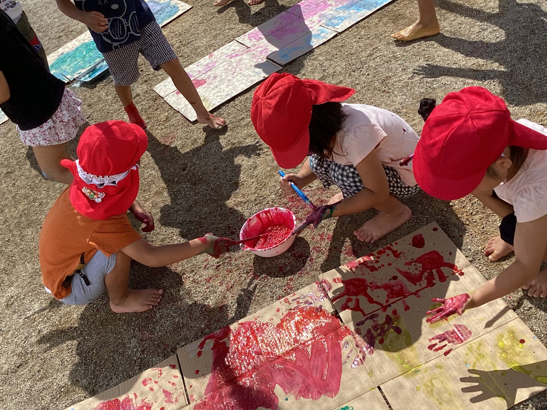大きな段ボールに手で絵の具を塗りたくったり、筆で色を塗ったりしました。