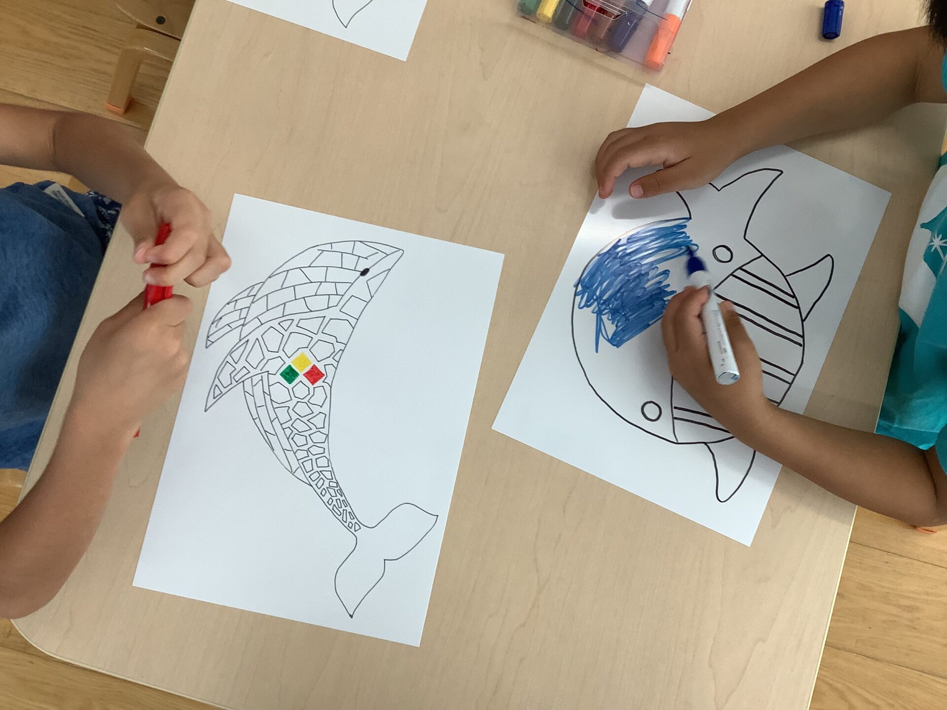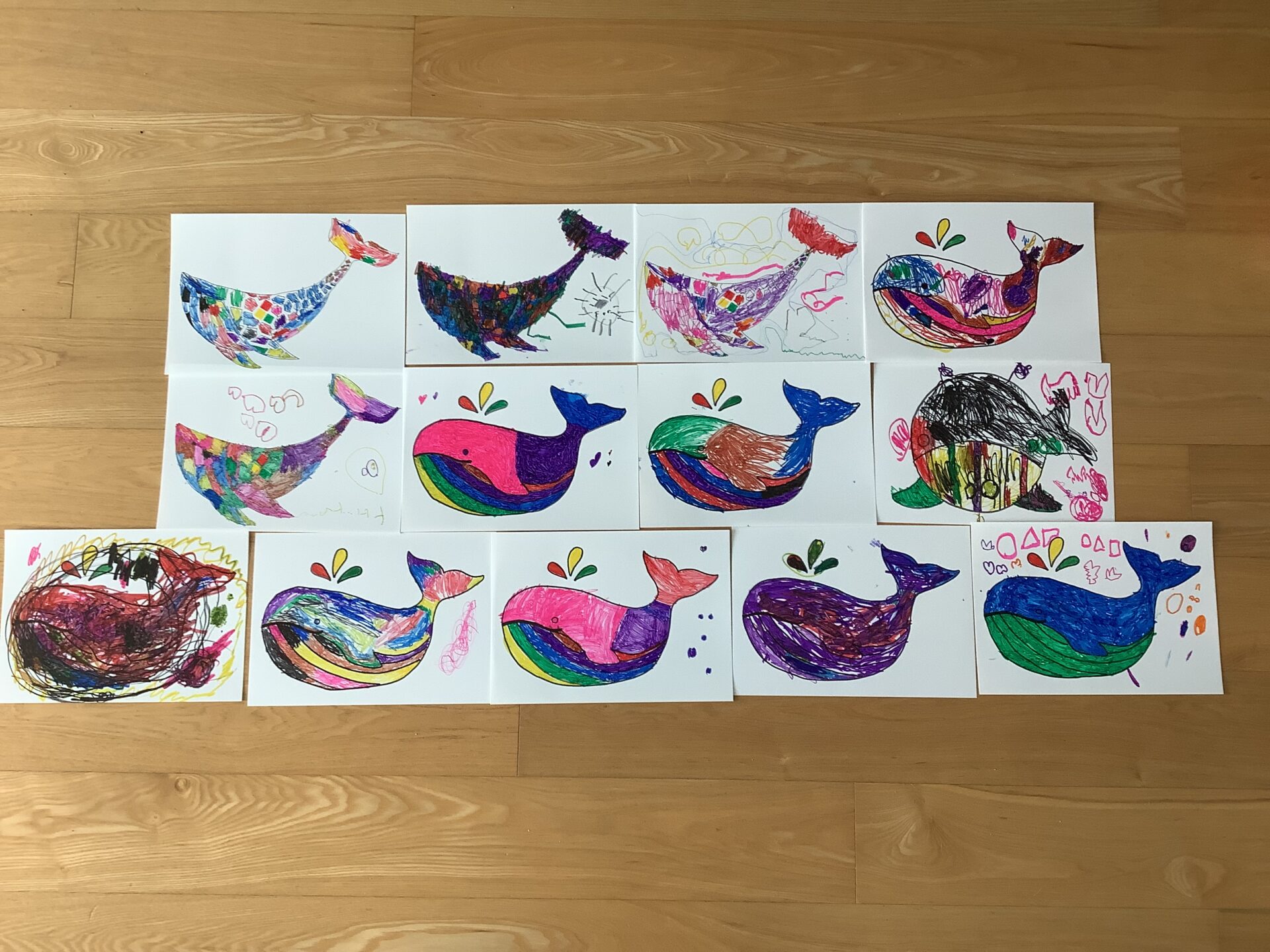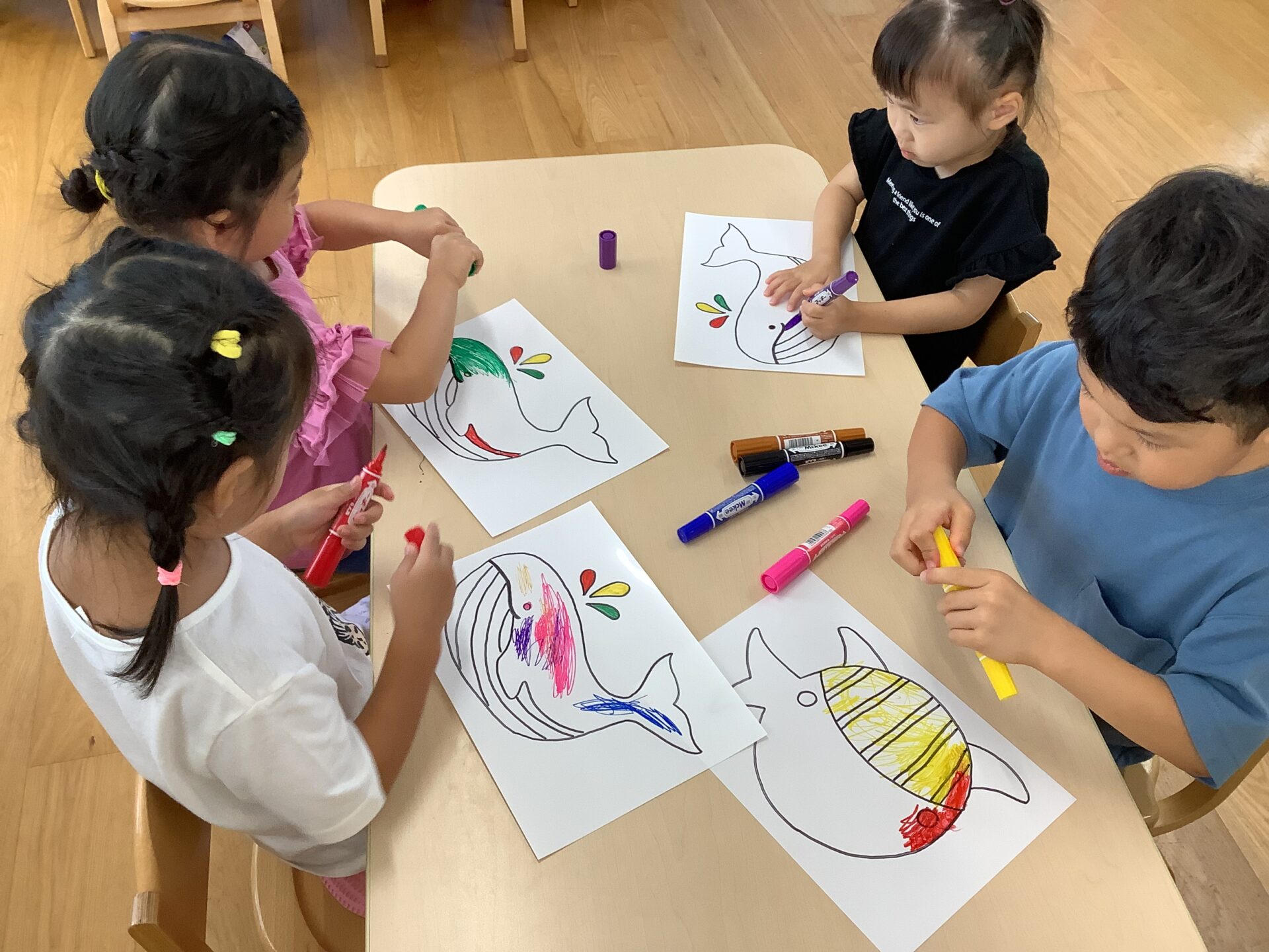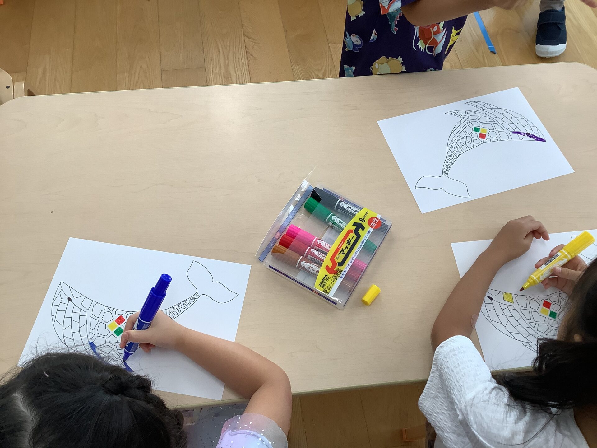 ホワイトプラ板のくじらに色をぬり、自分のくじらを完成させました。
