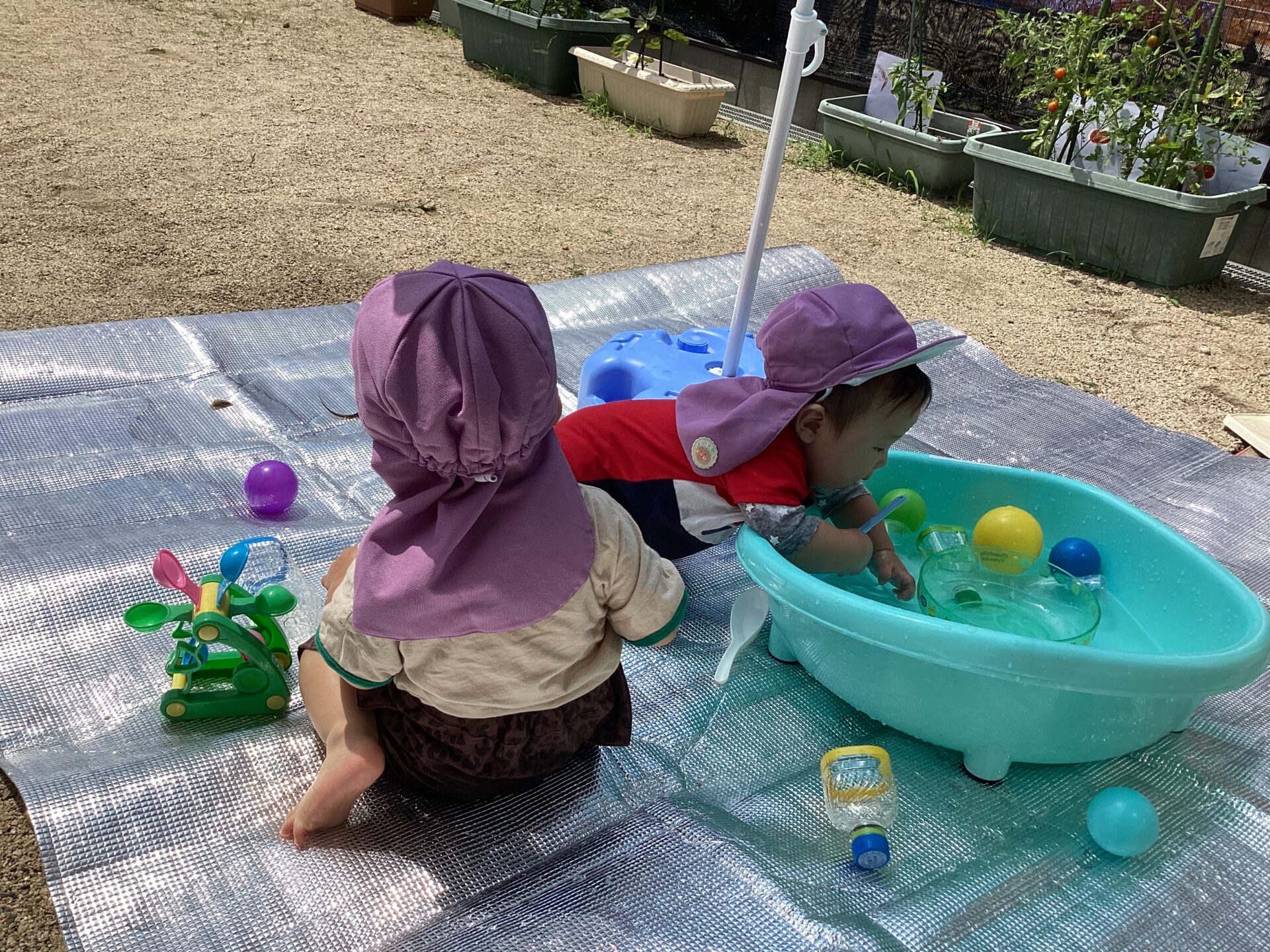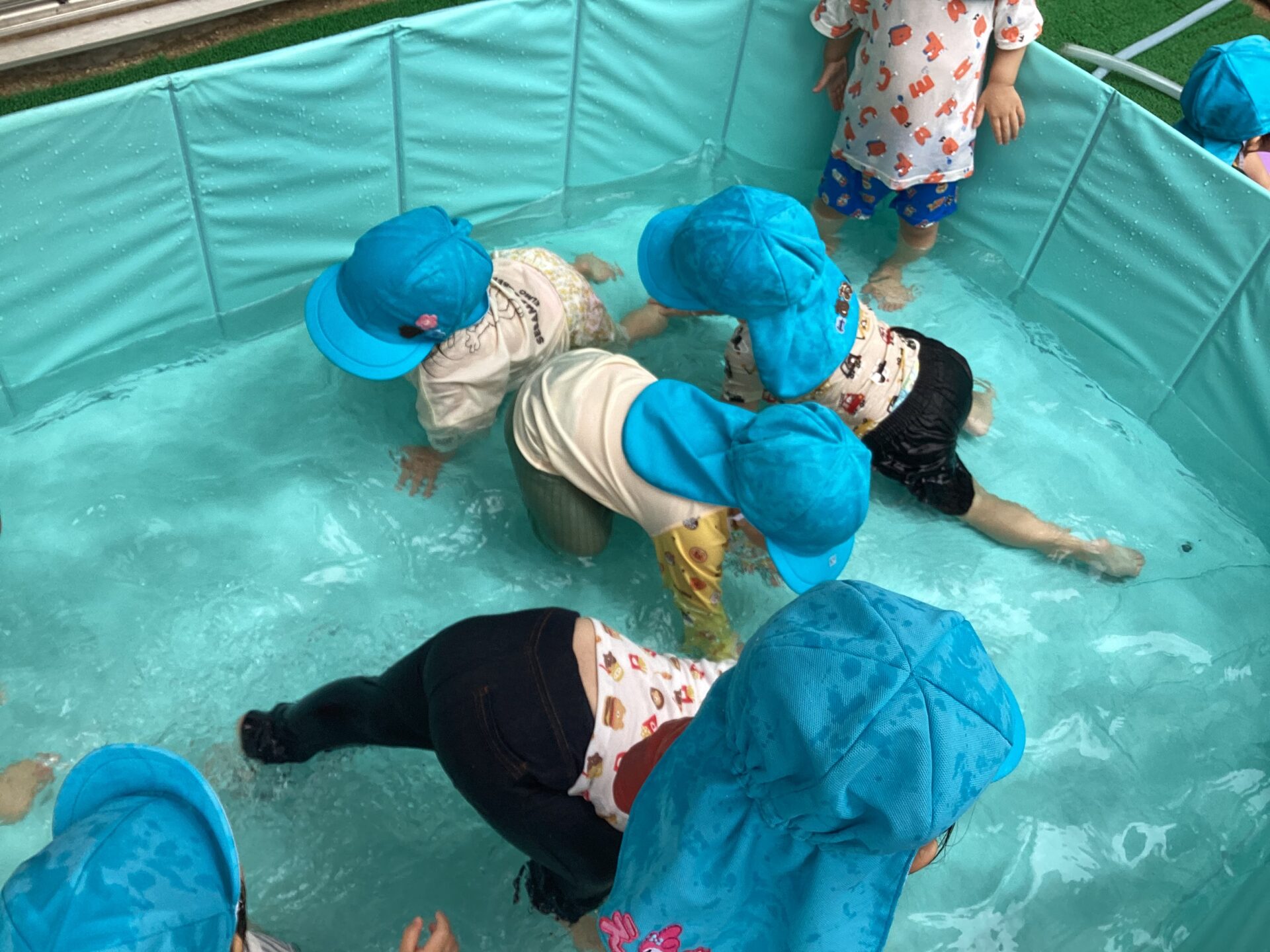 さっそく乳児クラスもプール遊びを楽しんでいます。