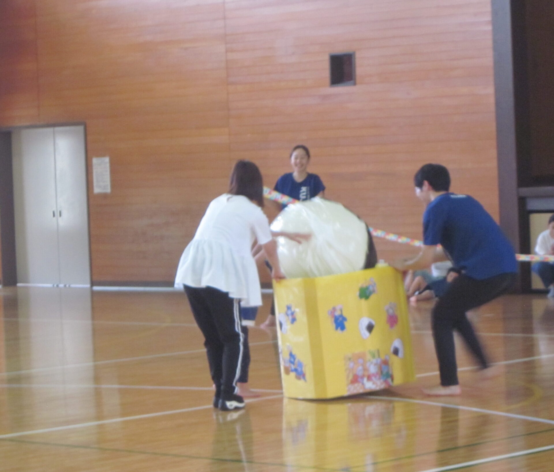 あめチームは親子で「おむすびころりん」をしました。ねずみに変身して親子でおむすびを穴の中へ。