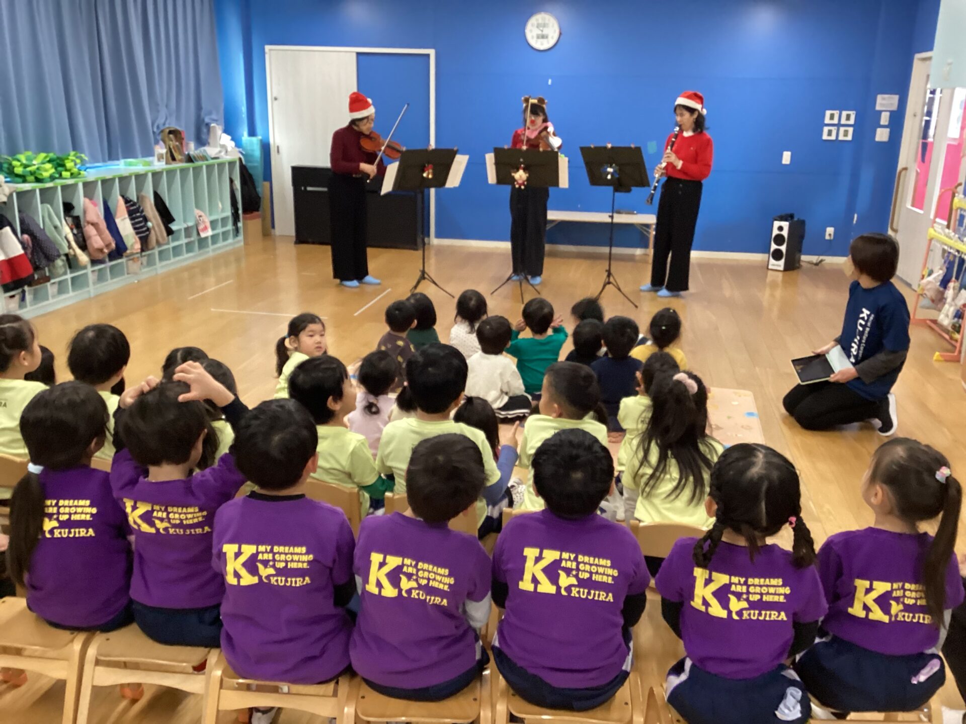 「小さな世界」や「さんぽ」など子どもたちになじみのある曲から、「赤鼻のトナカイ」「ジングルベル」など季節の曲まで演奏していただきました。優しく美しい音色に大人も聞き入っていまうほどでした。