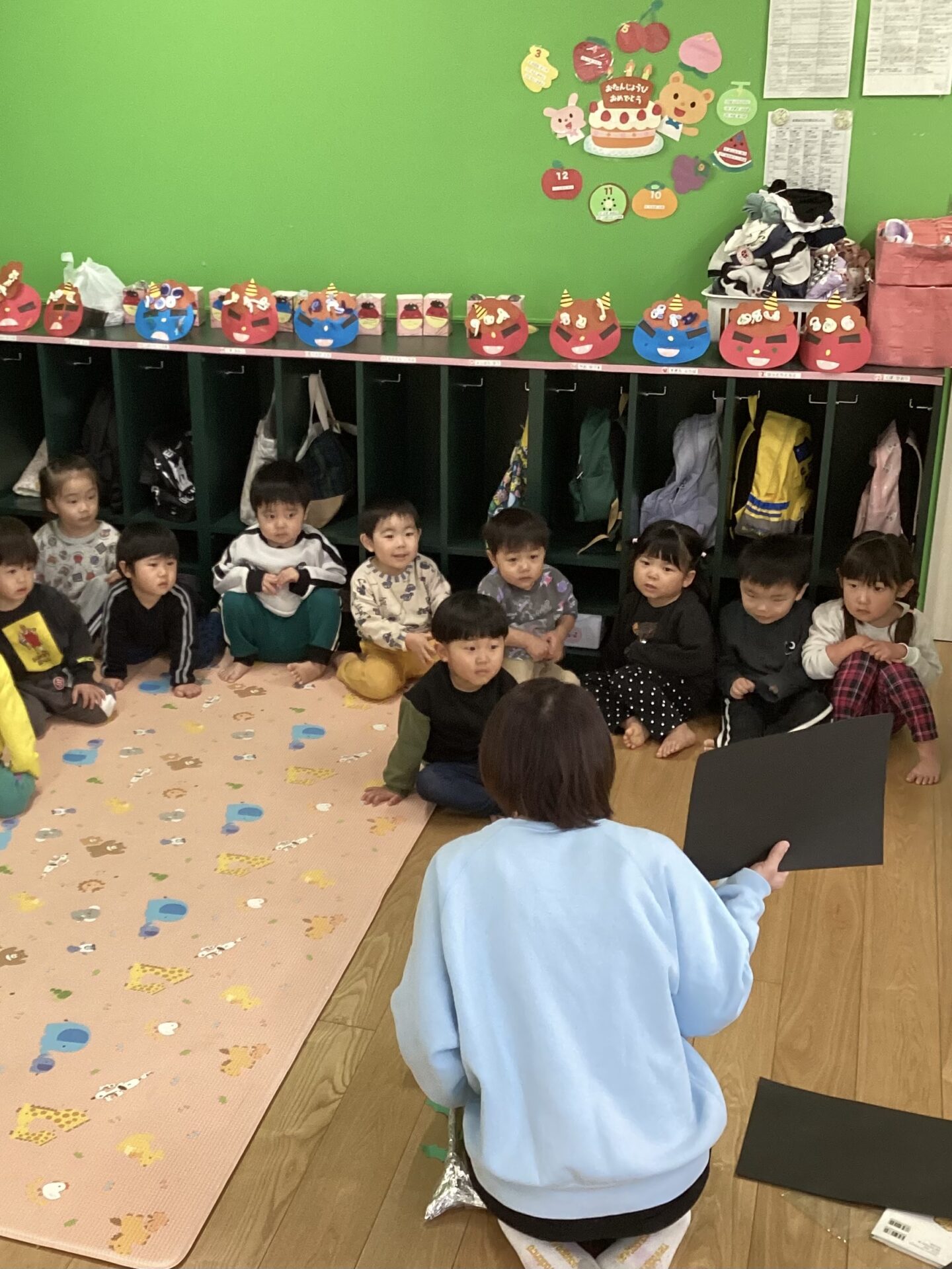 乳児クラスでは、おににちなんだ絵本を読んでもらいました。