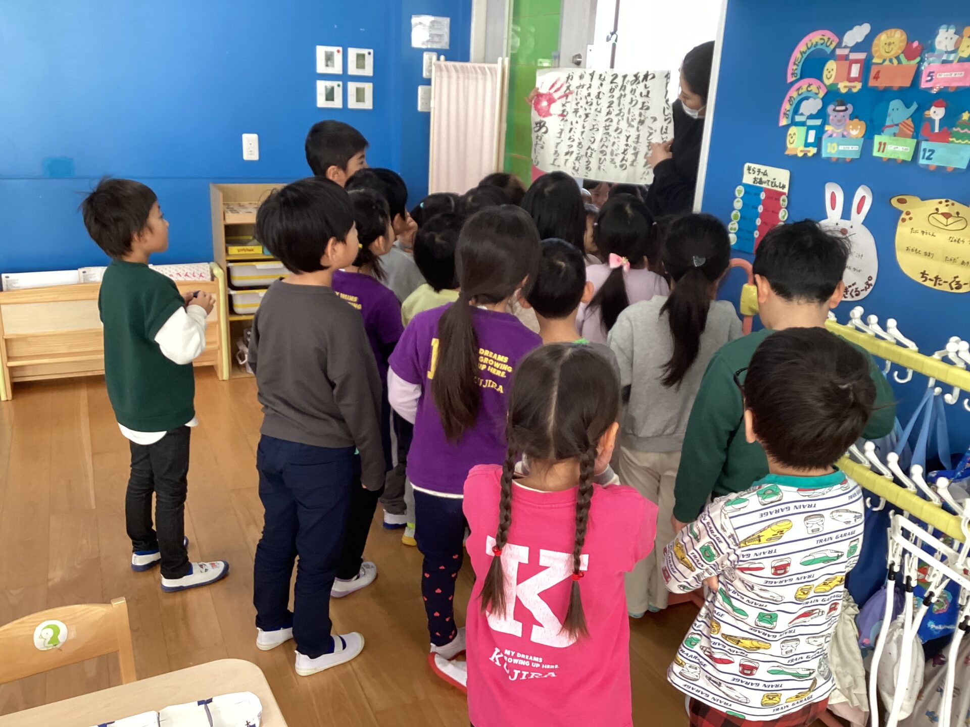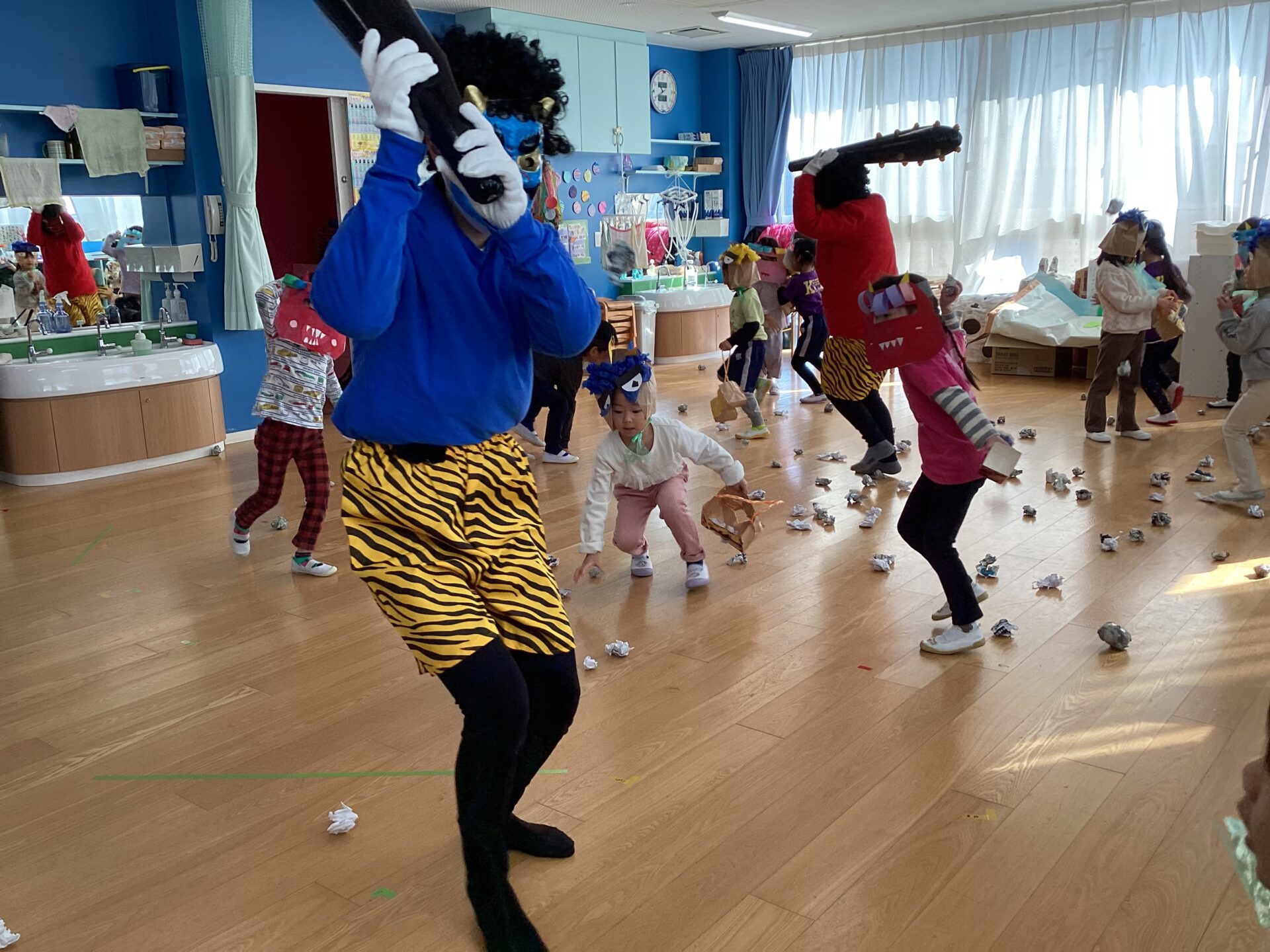 驚き、びっくりして怖くて逃げる子もいましたが、先生が連れていかれそうになると、先生を守ろうと、一生懸命に豆まきをしている子もいます。みんな怖がりながらも保育士と一緒に豆まきをしておにを追い払いました。