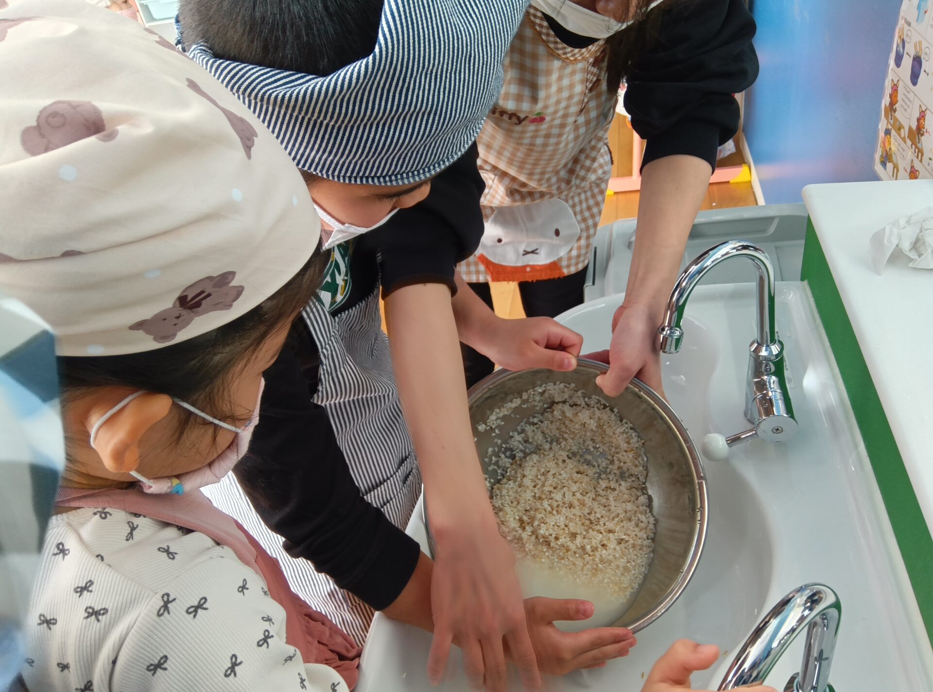 「給食もこうやって作るんかな。大変やな!」と、ご飯になる過程の大変さに驚きながら話す子や、「お家でもやったことある!炊飯器でお米炊くんやで」と家庭での経験を話す子もいました。