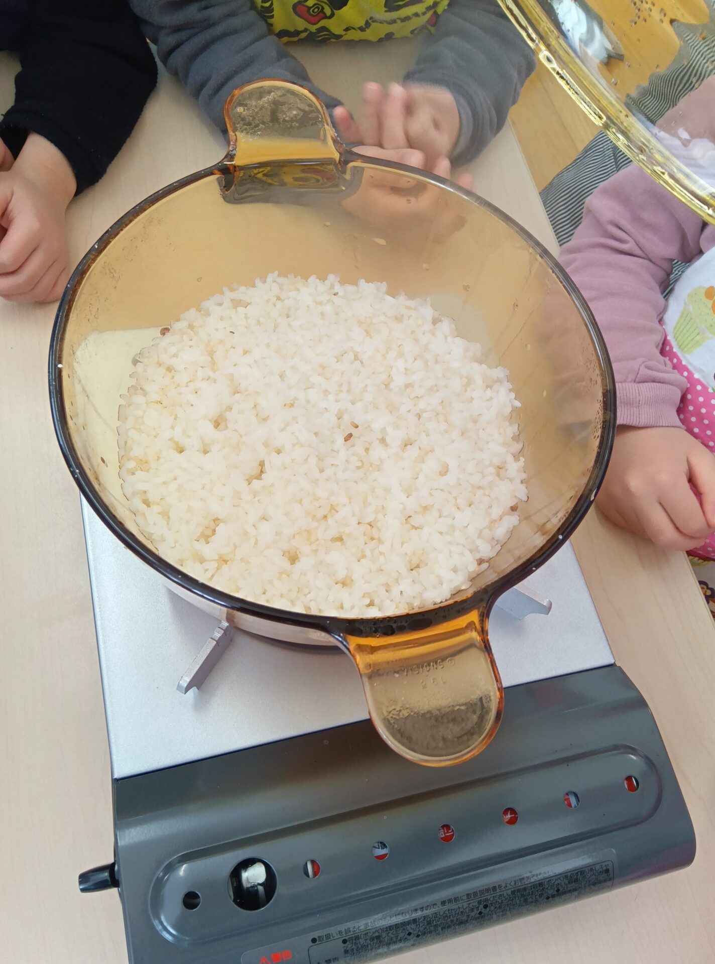 秋にお米を収穫したくじらチーム、お米を炊いて、食べる体験をしました。