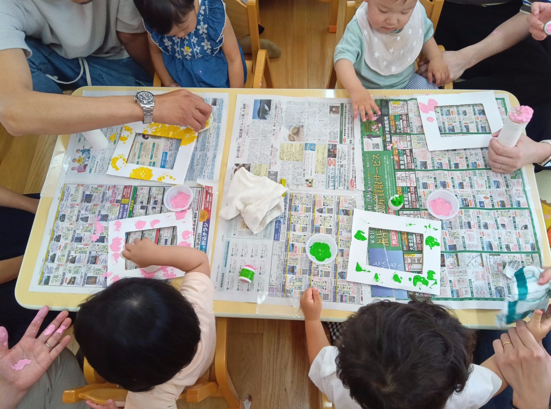 だいちチームは、スタンプ遊びをして写真フレームを作りました。お家の方と一緒で楽しそうな子どもたちです。
