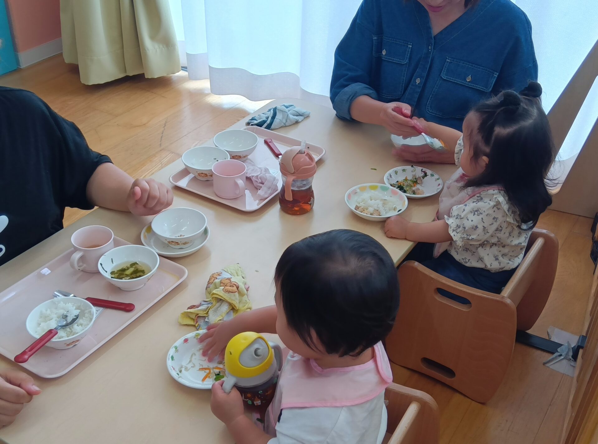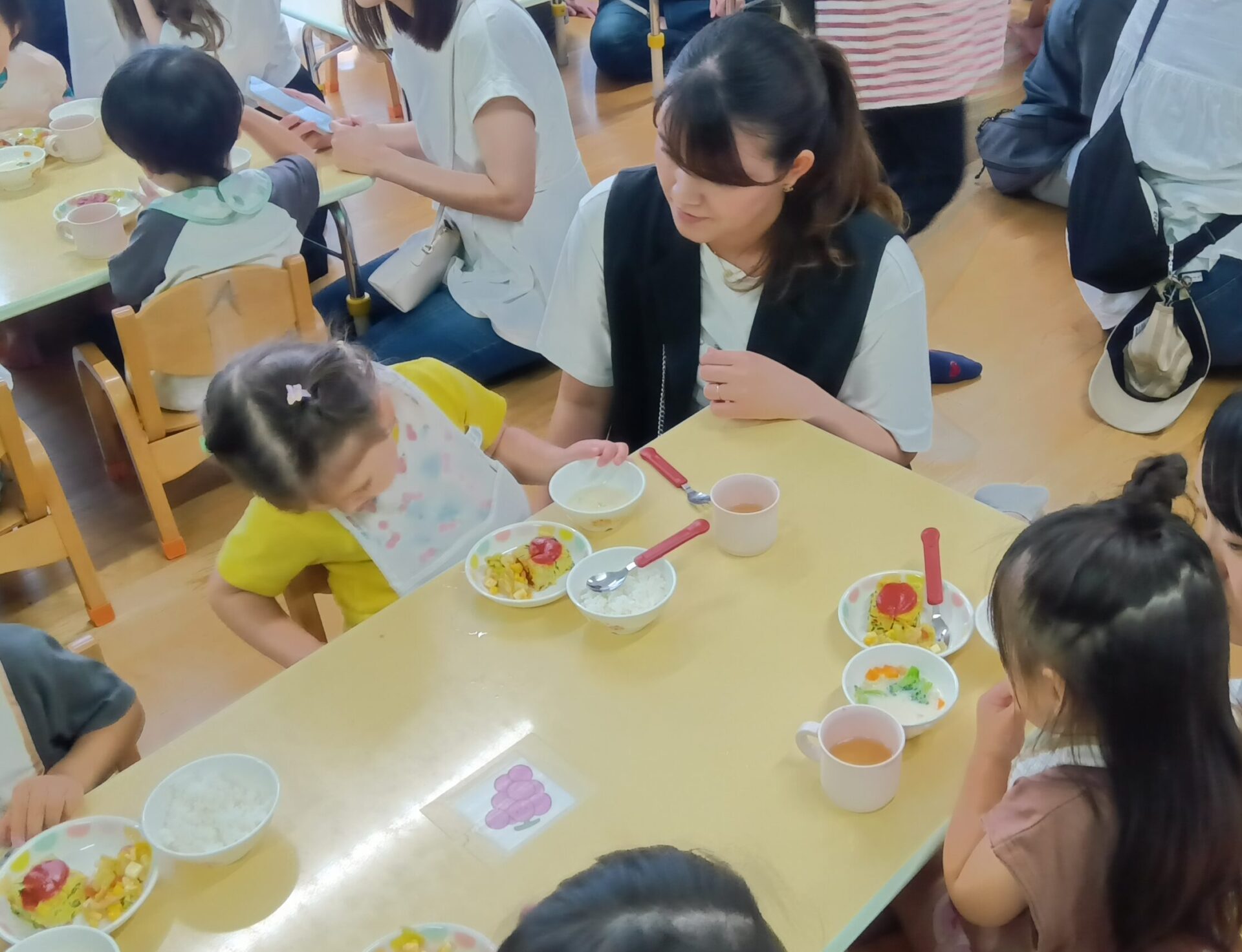 給食の様子も見ていただきました。お家の方と一緒でうれしくて甘えたり、「自分で!」と自分で食べるところを見てもらったりしました。