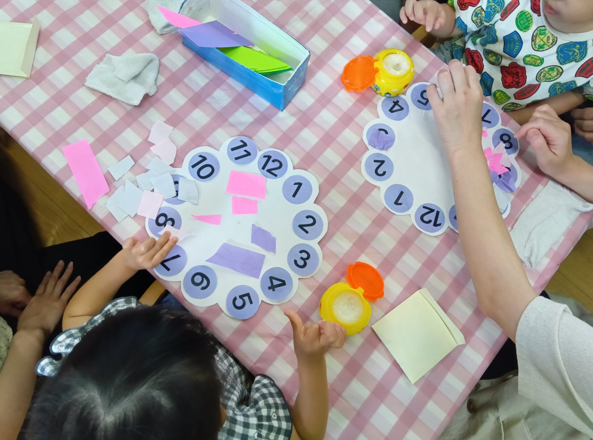 あめチームはのり貼り遊びをしてあじさいの時計を作りました。のりのふわふわベタベタな感触を味わいながら、お家の方と一緒に楽しい雰囲気のなか作ることができました。