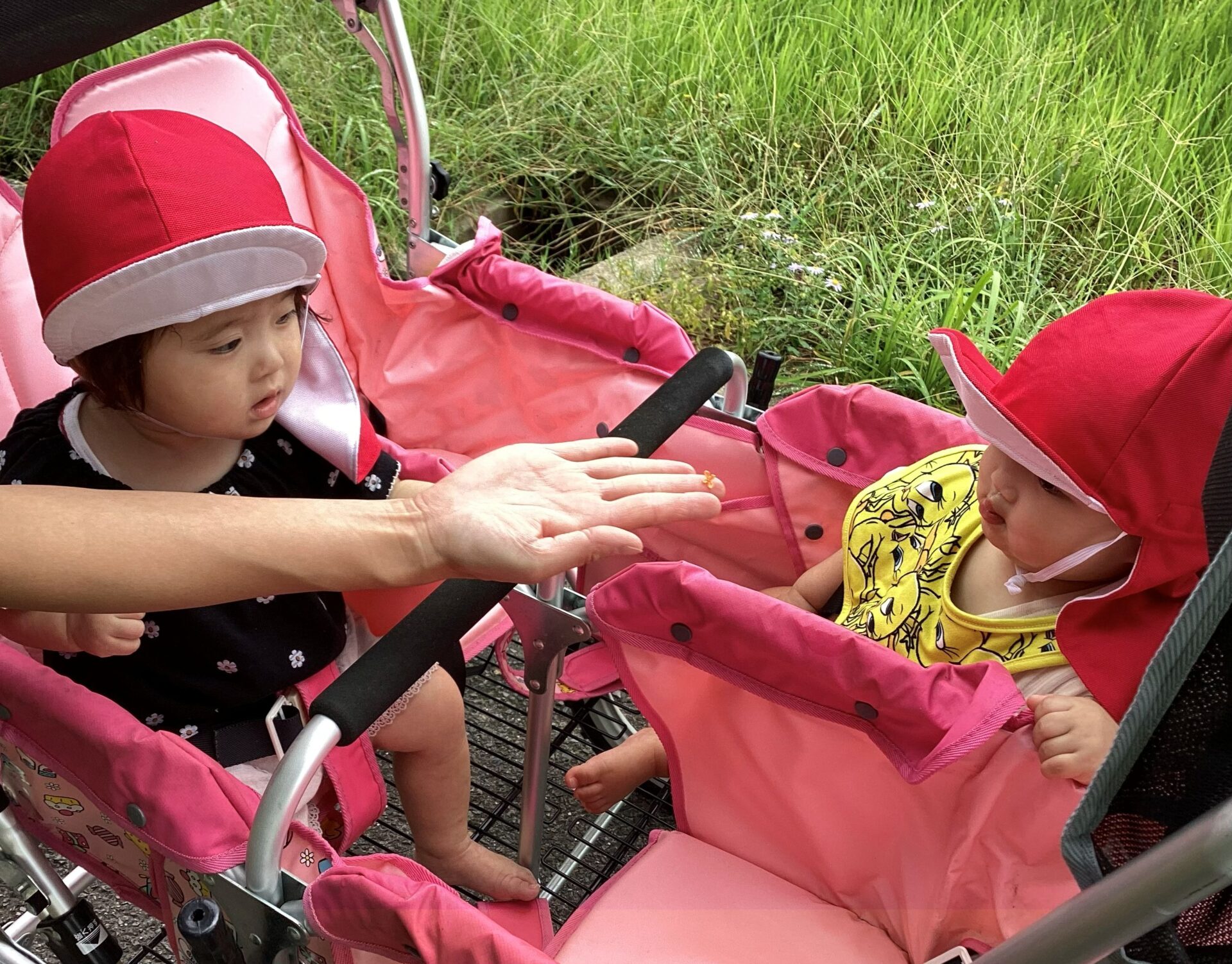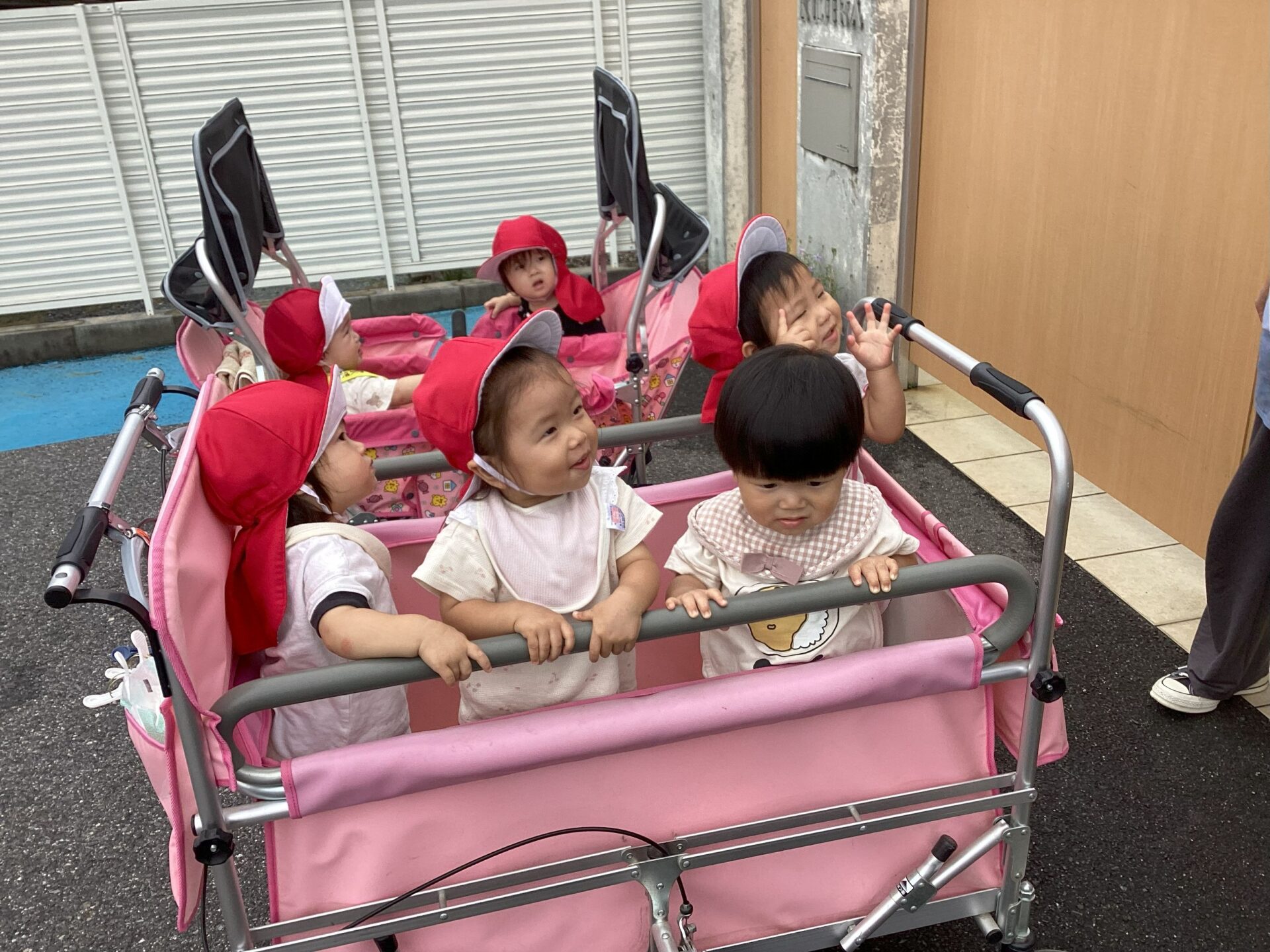 0歳児クラスでは、久しぶりにベビーカーと散歩車に乗ってお散歩に出かけました。外の空気に触れるのが嬉しくて、みんな笑顔いっぱいでした。