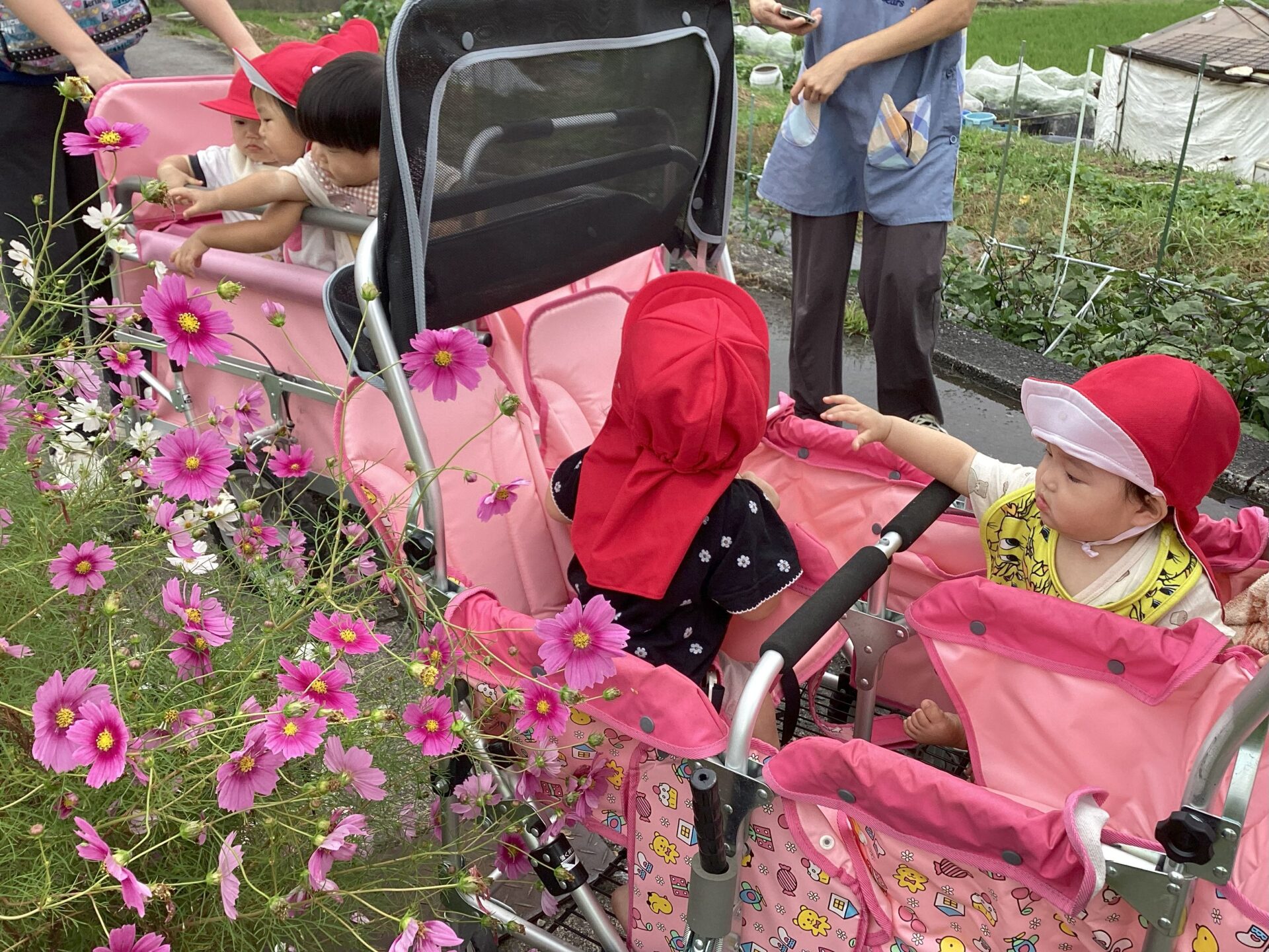 コスモスの優しい色や、エノコログサにも興味津々。指を差したり、手を伸ばしたりして秋の自然を楽しんでいました。