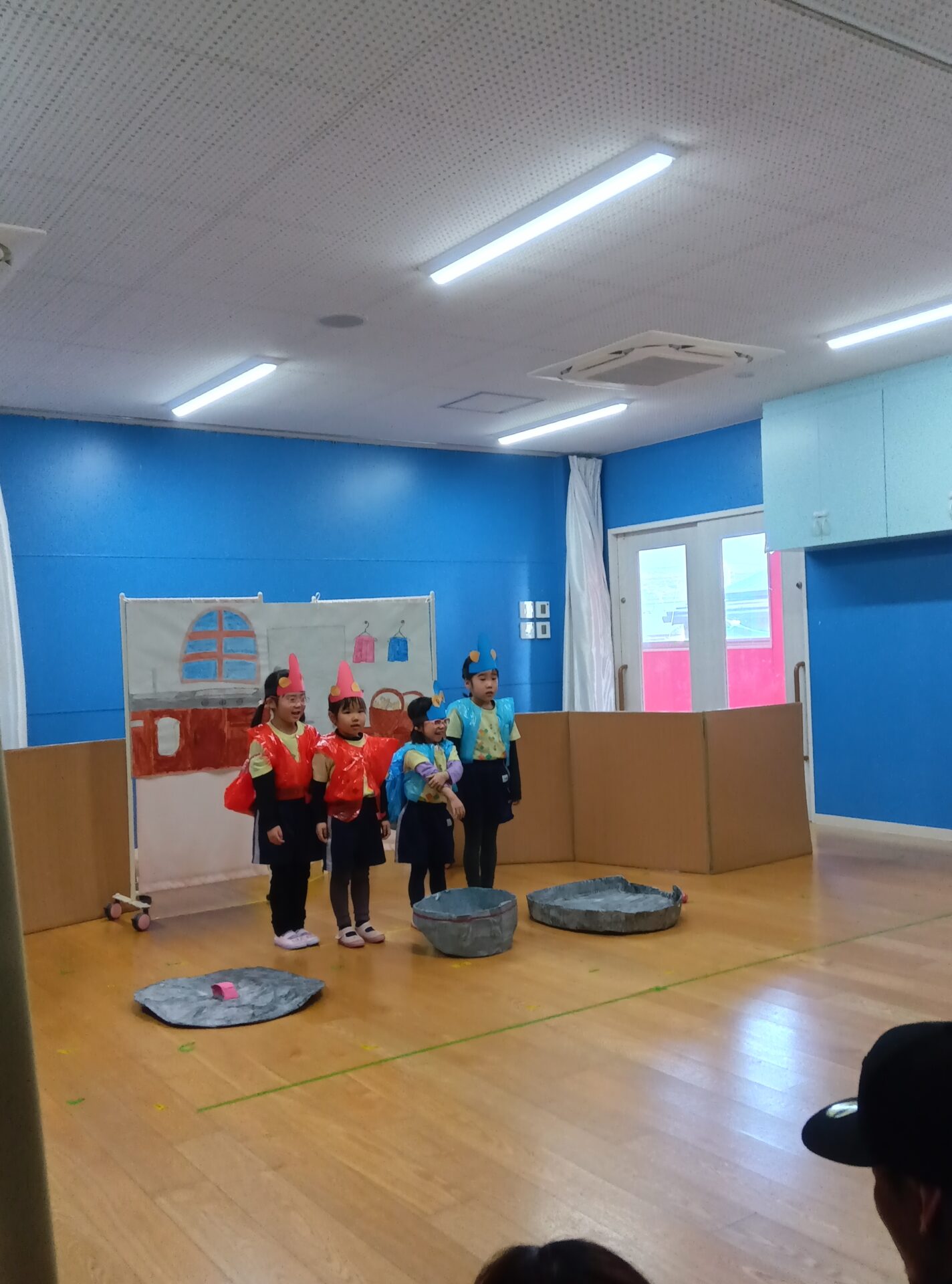 見てもらいたい気持ちとがんばろうとする気持ち、年長らしく頼もしく感じました。劇遊びでは長いセリフがなかなか言えなかったり、リズム打ちがバラバラになったりしていました。でも当日は、劇遊びはもちろん、合奏や手話での歌も気持ちがひとつになりやりきることができました。表現もとても豊かで指先まで楽しさを表していました。子どもたちの温かい気持ちが劇や歌、合奏に乗りみんなの気持ちに届いているようでした。